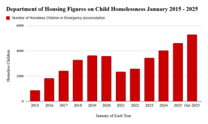 The Department of Housing figures for Child Homelessness over the last 10 years show that the issue is becoming worse with each passing year. In January of 2025, the number of children who were homeless and in emergency accommodation was 4,603, this is more than five the number Ireland had in 2015 where it was 856. From January to October of 2025 there has been a total increase of 14.6%.