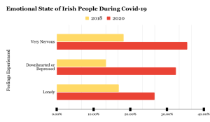 The Social Impact of Covid-19 Survey 2020, from the Central Statistics Office (CSO), shows that during covid Irish people experienced a significant increase in feelings of nervousness, depression and loneliness during the pandemic when compared to 2018. The statistics show that 35.5% of Irish people reported ‘being very nervous’, 32.4% were ‘feeling downhearted or depressed’ and 26.6% were ‘feeling lonely’.