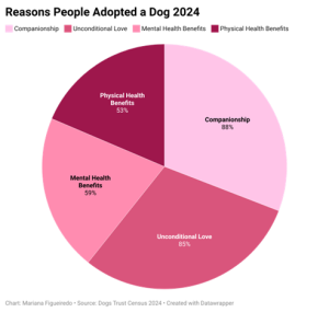 The increase was so significant that Dogs Trust, a well-known charity organisation for dogs in Ireland, began the country’s first ‘Dog Census’ in 2024. According to their report, 88% adopted a dog for companionship, 85% for unconditional love, 59% for mental health benefits and 53% for physical health benefits, when asked why they got a dog.